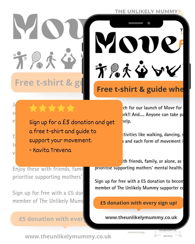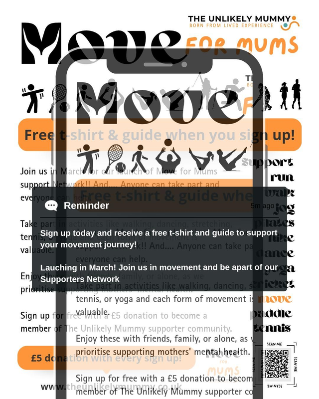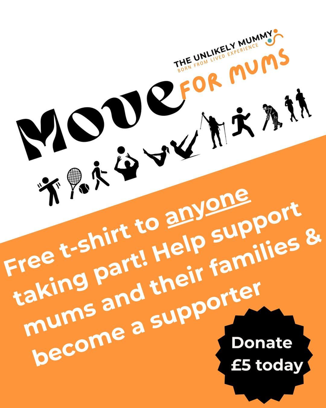 The Move for Mums T-shirts are free. However, we kindly ask for a £5 donation. This helps The Unlikely Mummy continue its vital work supporting mums’ mental health through safe, inclusive community spaces and practical support.
